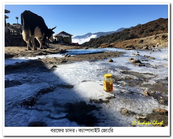 ব্রেকফাস্ট করে দলের বাকিরা জোংরি টপের দিকে রওনা হল। মেঘ কেটে আবার নীল আকাশ। সামনের পাহাড়ি ঝোরা জমে বরফ। বরফে আগায় চকচকে রোদ। রোদে গা ভিজিয়ে বই খুলে বসেছে একজন। সম্ভবত রাশিয়ান। সামনে চরে বেড়াচ্ছে ইয়াক (আদতে Dzo)। গলায় বাঁধা ঘণ্টার টুং টাং শব্দ ঘুরে ফিরে ভাসছে বাতাসে। নিচের উপত্যকায় একদলা সাদা মেঘ। ট্রেকার্স হাট লাগোয়া এক চিলতে দোকানে পসরা সাজিয়েছে পাহাড়ি আন্টি।