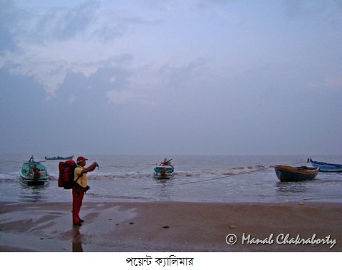 সমুদ্রের হাতছানি। ঢেউয়ের গর্জন। অচেনা সৈকত। রাত কেটে গেল। বেরিয়ে পড়লাম। আমাদের যাত্রা শুরু হল। পয়েন্ট ক্যালিমারের সমুদ্র পারে অনেকগুলো মাছধরা যন্ত্রচালিত নৌকা দুলছে। বা কেউ রাতভর সমুদ্র-সফর সেরে ফিরছে। সূর্য উঠি-উঠি। সৌমেন শুভব্রতরা ছবি তুলল। ফেনিল সমুদ্র ঢেউ আছড়ে পড়ছে। সেই ভেজা বালিতে পা ফেলে ফেলে আমরা এগিয়ে চলেছি।